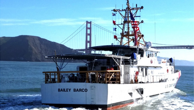 Coast Guard Cutter Bailey Barco enters San Francisco Bay during the 6,200-mile trip from Key West, Florida, to its homeport in Ketchikan, Alaska, April 28, 2017. The cutter is the second fast response cutter based in Alaska. U.S. Coast Guard photo.