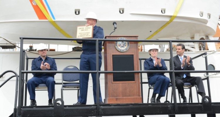 The Coast Guard marked the completion of the service life extension project (SLEP) for the barque Eagle with a ceremony at the Coast Guard Yard in Baltimore April 24. Speakers included Capt. Matthew Lake, commanding officer of the yard; Capt. Matthew Meilstrup, commanding officer of Eagle; Vice Adm. Sandra Stosz, deputy commandant for mission support; and U.S. Representative John Sarbanes.