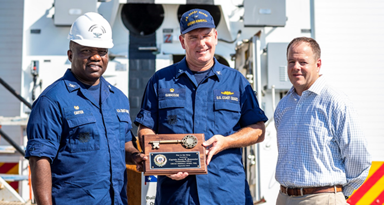 Capt. Travis Carter (left), commanding officer of Project Resident Office Gulf Coast, and Capt. David Ramassini (center), prospective commanding officer of national security cutter (NSC) Kimball, hold the ceremonial key to the ship as Derek Murphy (right) of Huntington Ingalls Industries looks on. The Coast Guard accepted delivery of Kimball, the seventh NSC, in a Sept. 19, 2018, ceremony in Pascagoula, Mississippi. Photo courtesy of Derek Fountain/Huntington Ingalls Industries.