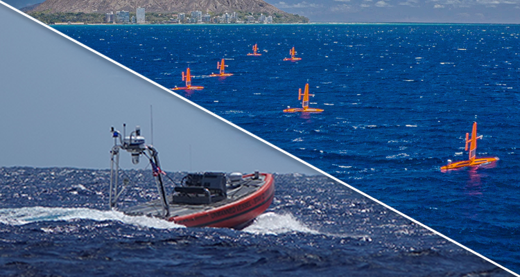 A Spatial Integration Systems Watcher diesel-powered unmanned surface vehicle (left) and Saildrone wind-powered unmanned surface vehicles (right) operate near the coast of Oahu, Hawaii, Oct. 7, 2020, as part of the Coast Guard Research and Development Center's Low Cost Maritime Domain Awareness Pilot Study. U.S. Coast Guard photo.